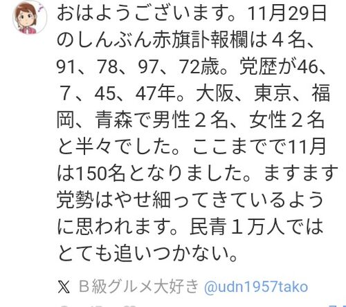 連投の記事です。 先ほどは赤旗配達者の事故・逝去に関する記事を書いてきましたが、その過程でさらなる性質の悪さを見かけたので糾弾する記述をしていきます。 しんぶん赤旗は言わずと知れた日本共産党の機関紙で、12面には党員のお悔やみ欄が記載されてい…