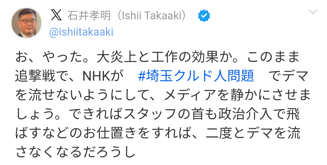 2025-04-09 ETV特集再放送延期。石井孝明の発言に警戒を。良心的なスタッフを守れ! NHK・ETV特集はクルド人などへのヘイトをかき立てる面々の酷さを明らかにした番組でした。当初再放送が予定されていましたが、何らかの作用が働いたせいか見送られたようで、アーカイブも消されています。 このヘイト拡散者・石井孝明が下記のような言葉を吐いています。スクショ、引用。 権力者の尻馬に乗って「殺してもいい」と認識した者を虐殺してきたんだなというのを思わせる一幕です。